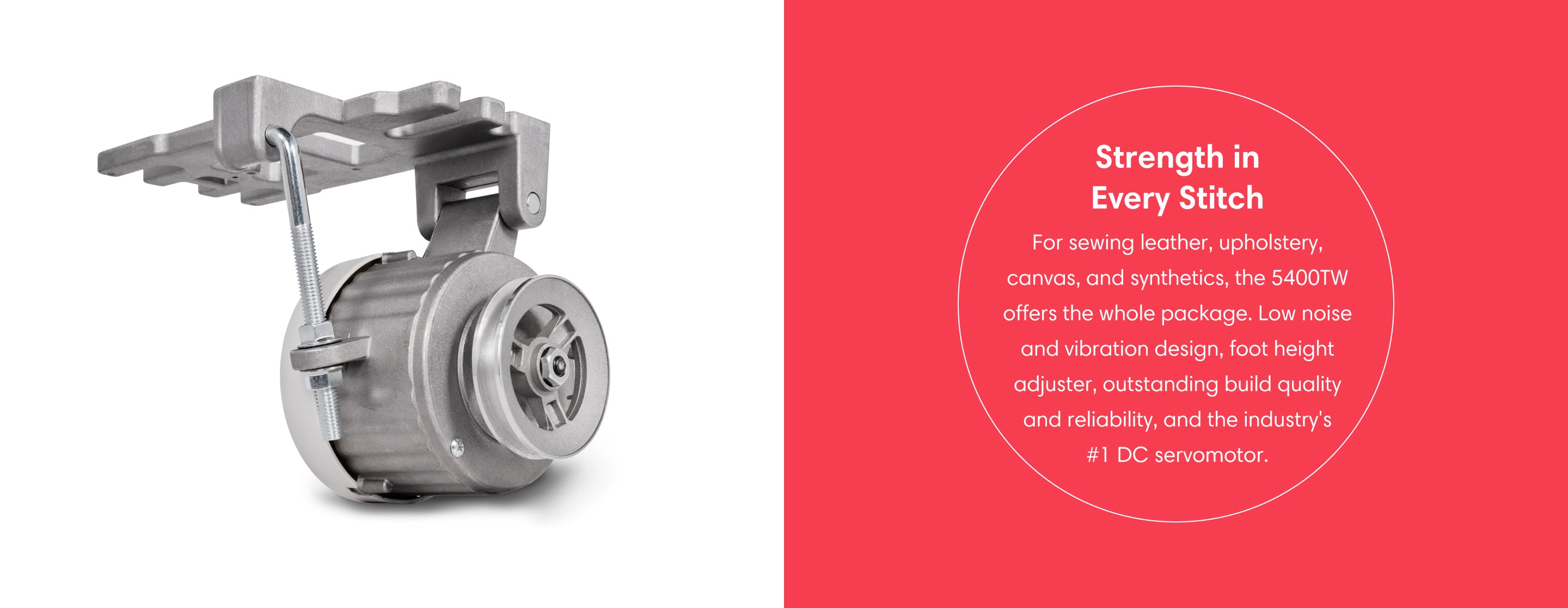 The feature and performance packed 5400TW two-needle, compound feed sewing machine is perfect for all types of medium to heavyweight leather, canvas and synthetic material. And with its top loading large capacity hook it’s easy to add a binder attachment on the slide plate. The 5400TW has the added advantage of having an automatic oiling system, plus a safety clutch, 16mm foot lift, stronger thread tension assembly and the #1 SewQuiet™ servo motor.