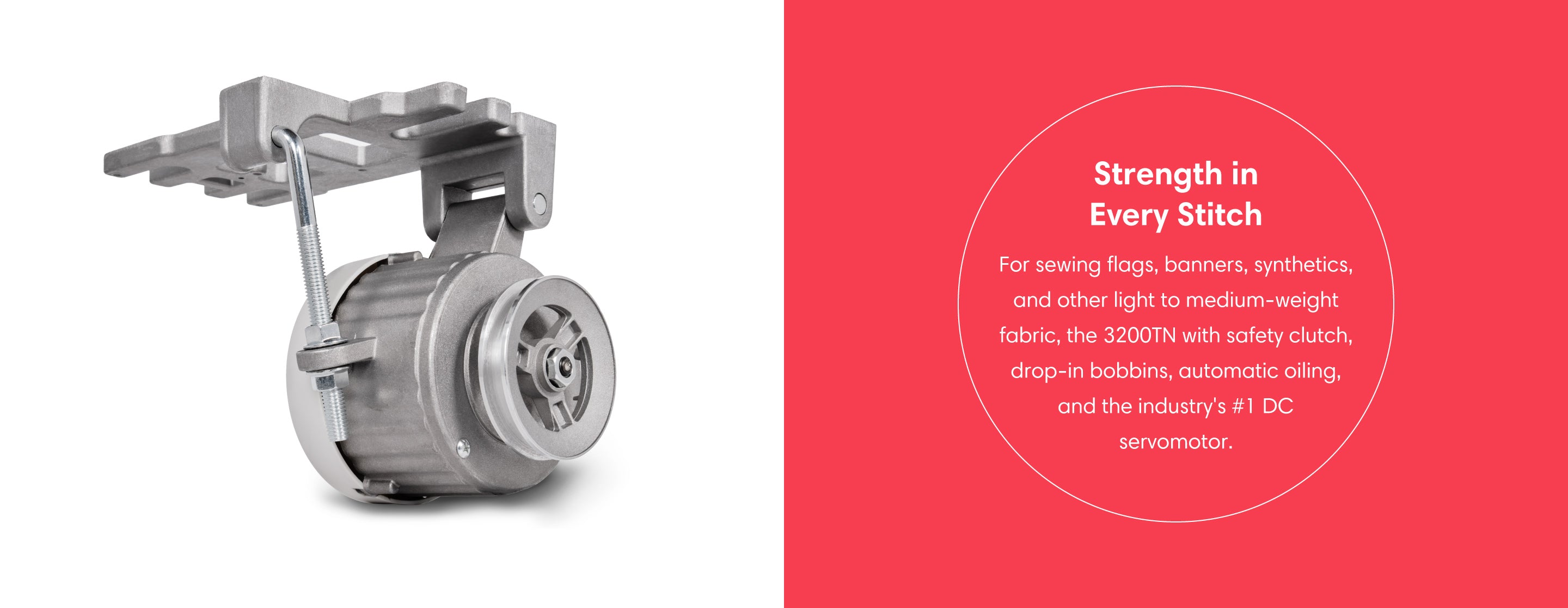 When is it time to get a needle feed sewing machine vs. a drop feed sewing machine. Typically, if you are sewing two ply’s of slippery fabric together or top stitching and you experience the fabric puckering you might be a candidate for the 3200TN two needle, needle feed machine. With the needle moving in unison with the feed dog, the added contact with the fabric can make puckering a thing of the past. We supply the 3200TN with the #1 SewQuiet servomotor.