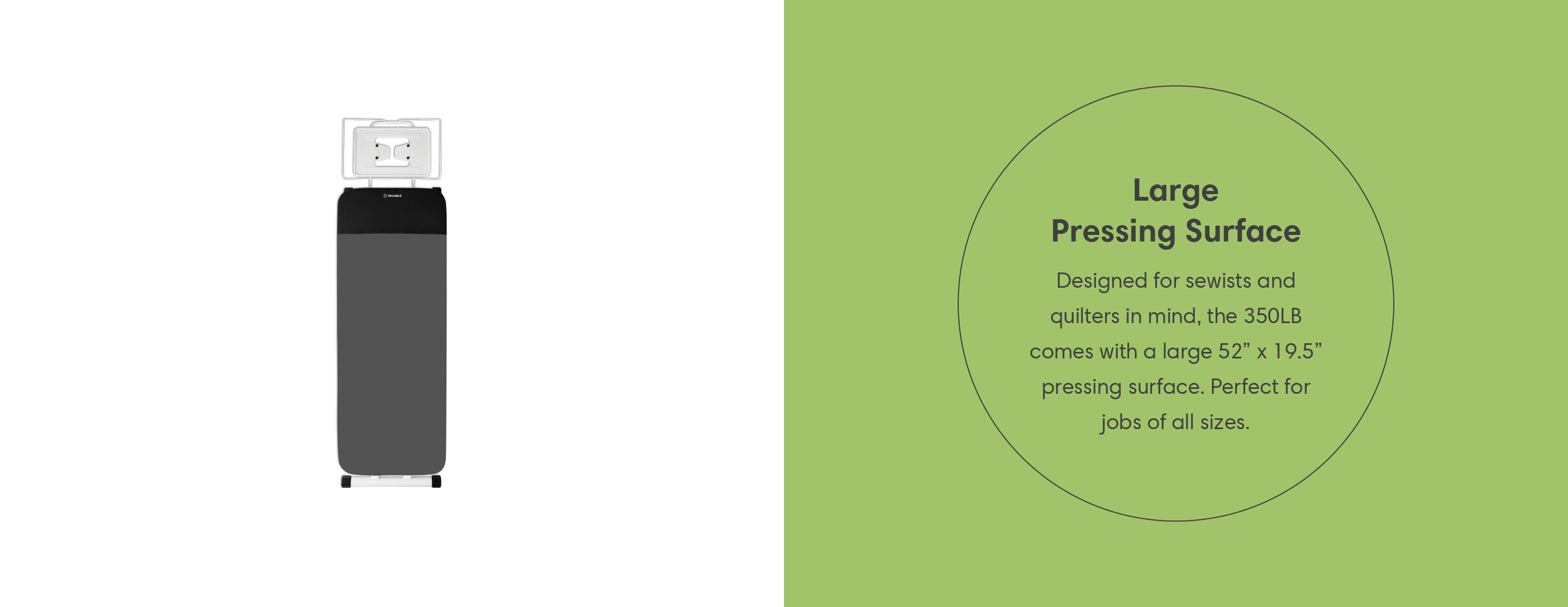 If you’ve been thinking of a larger ironing surface, but you don’t require the added flexibility of our two-in-one 320LB, we are pleased to present the all new 350LB - one piece extra large (Longboard) ironing table. The 350LB is perfect for quilters, ironing linens, curtains, crafting and pretty much anything else where an extra large surface will be a benefit. This is a board made without compromise. It was designed to provide maximum stability and features to make pressing less work.