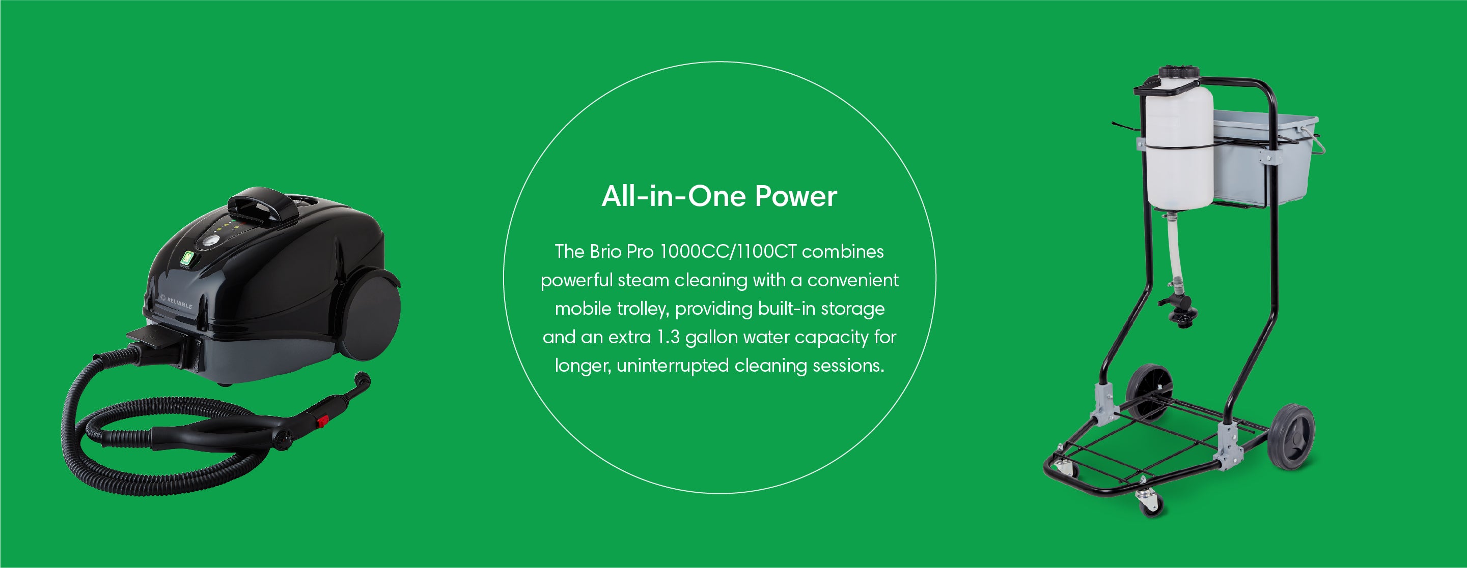 The versatility of the Brio Pro 1000CC means it will be one of the only tools you'll need for a completely clean environment. Clean hard floor surfaces, grout, kitchens and bathrooms, workout rooms, pet areas, auto interiors, and much more.