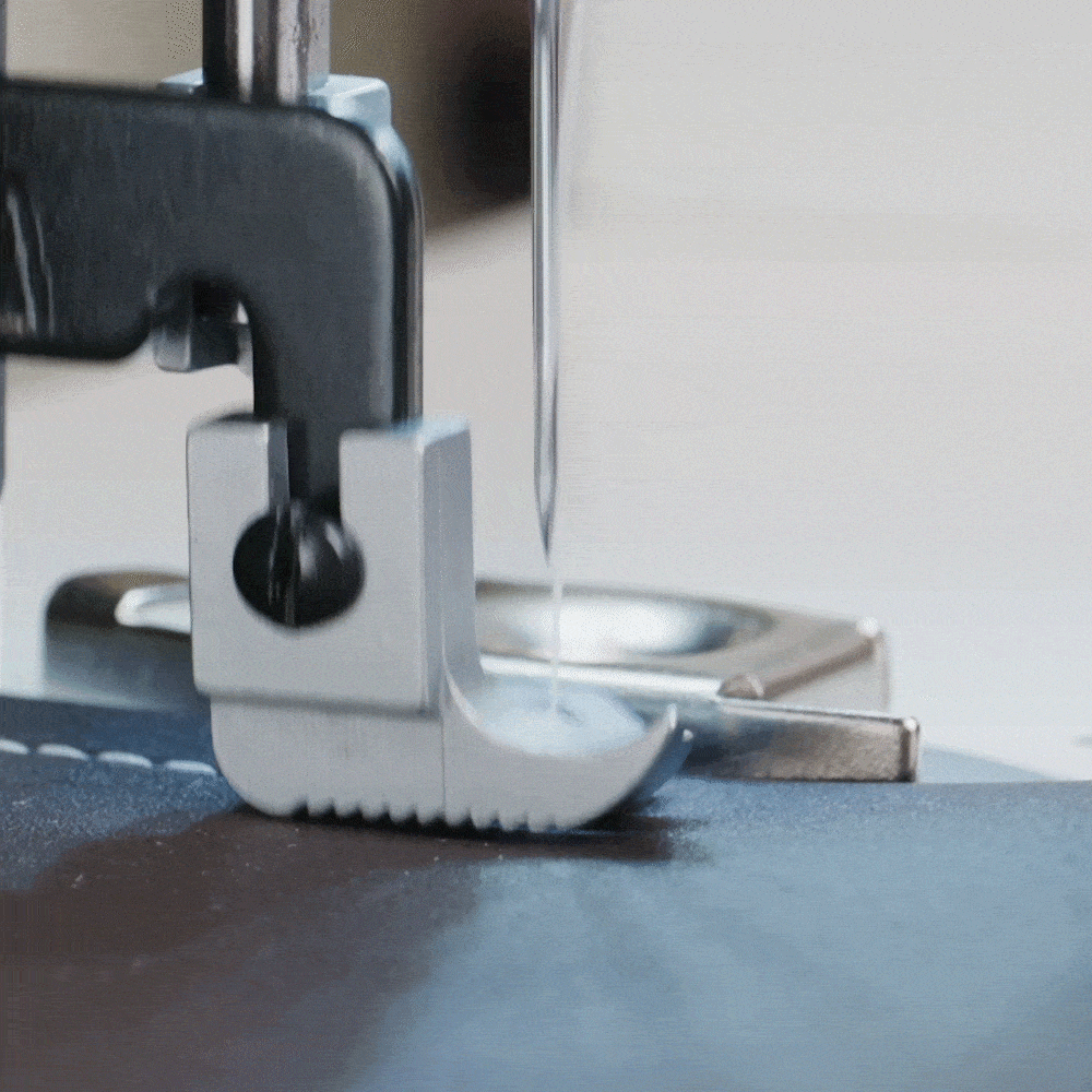 Walking foot technology for smooth feeding of heavy to medium fabrics.