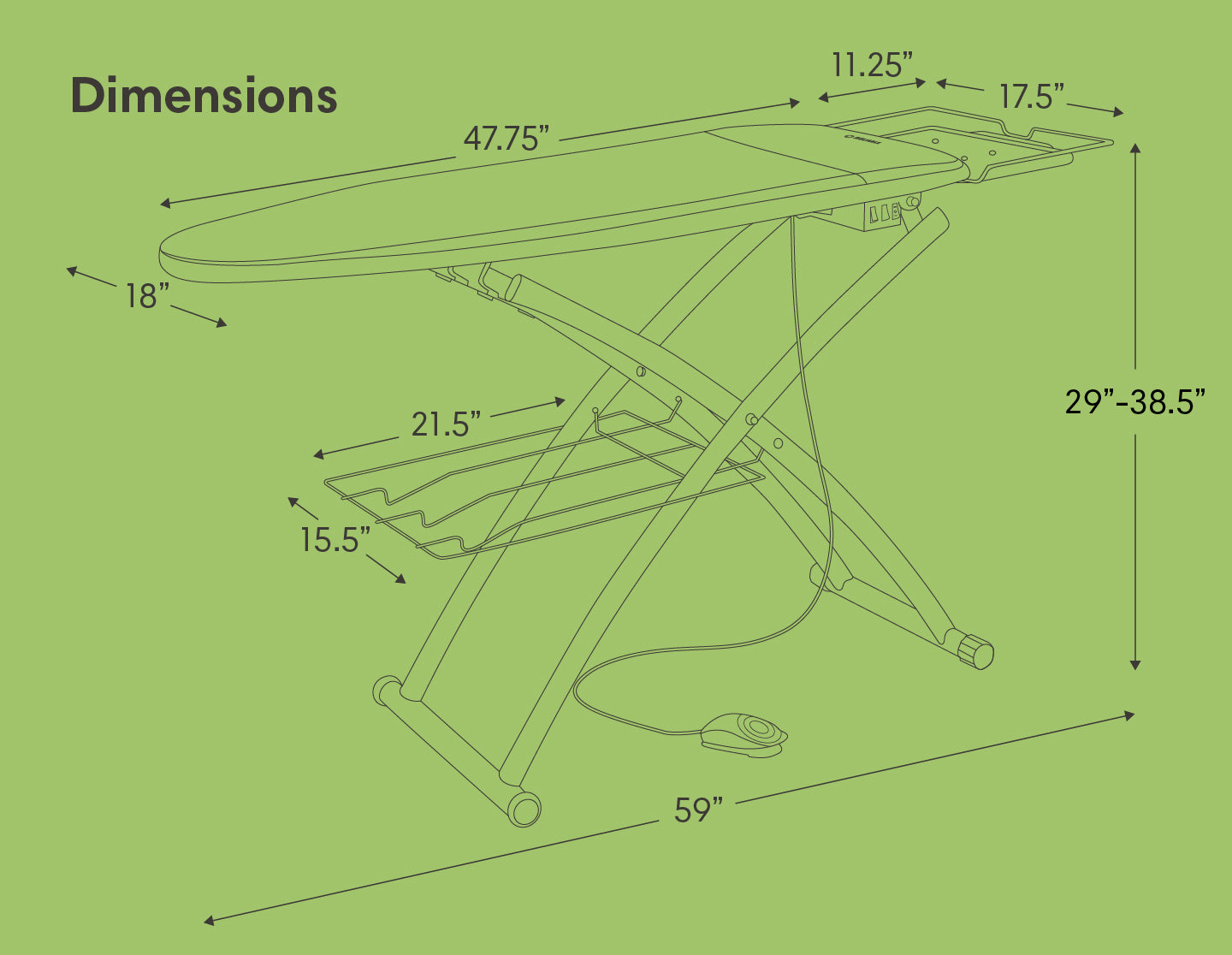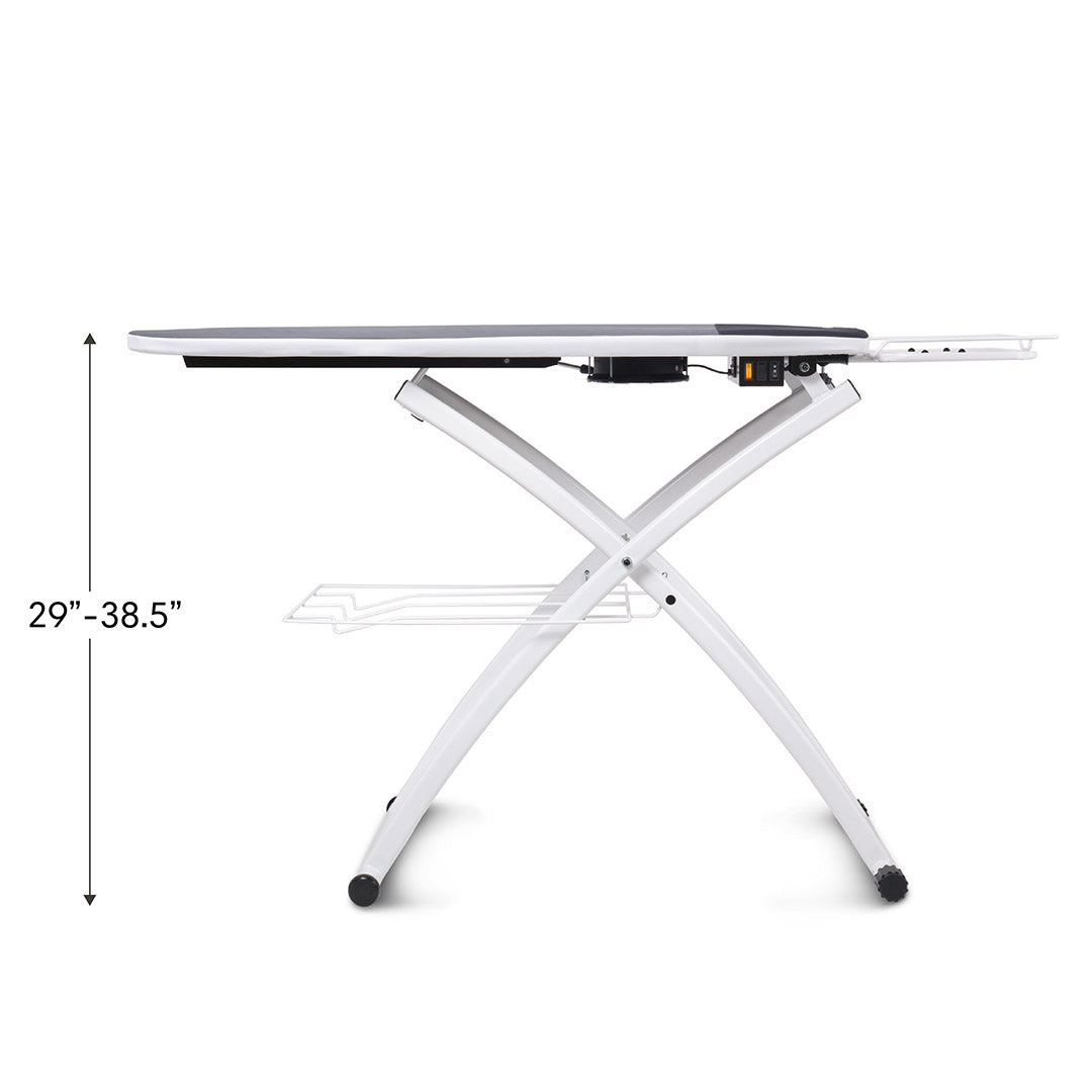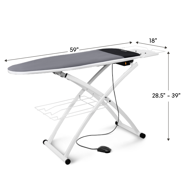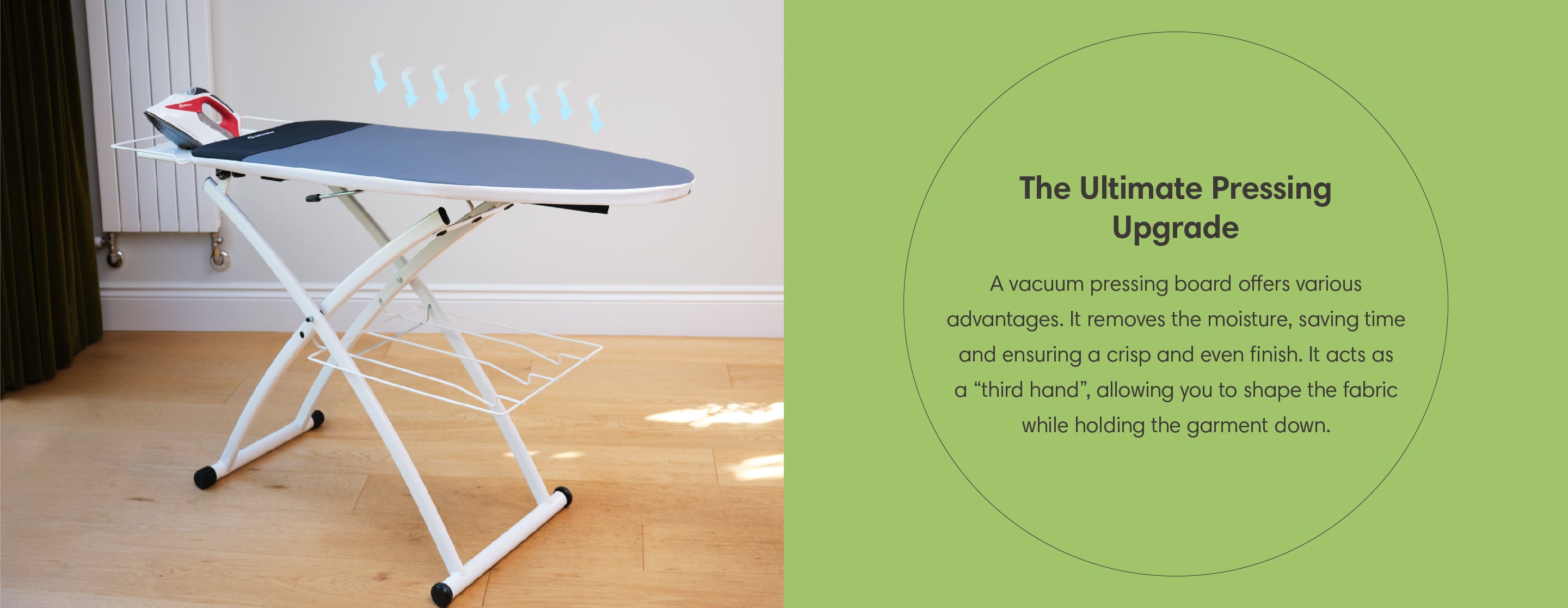 The 600VB Vacuum & Up-Air Ironing Board is designed for professionals who demand exceptional results, now upgraded with enhanced features for added convenience and performance. It combines powerful vacuum and up-air functions to keep the ironing surface dry and your garments crisp. Use the vacuum to press shirts or set sharp creases, while the up-air function is perfect for delicate fabrics, gently lifting them to prevent impressions and preserve texture. The 600VB also features a removable iron rest with a built-in Conex® heat resistant zone—safe up to 700°F and flame retardant, so you can rest your iron with confidence. Completing the board is our Vera Foam memory foam cover set, developed in-house for a lightweight, breathable, and ultra-smooth ironing experience that enhances comfort and precision with every press.