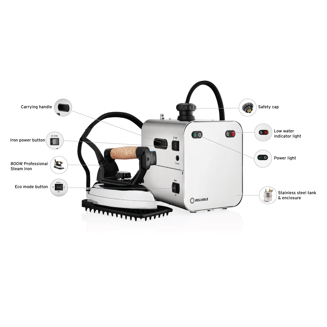 Introducing Eco-Mode in the all new 4100IS steam iron station. Eco-Mode will save you up to 33% in energy costs by reducing the energy consumption when the boiler is not being used. Smart for your wallet and smart for the planet. The 4100IS has an absolute capacity of 2.2L, uses our new external heating element system to optimize the amount of steam available to use and has an operating pressure of 3.5 bar / 50 P.S.I. for maximum ironing efficiency. The professional cork handled iron, made for tailors, seamstresses, sewists and garment production uses our exclusive 32 steam chamber design to prevent condensation and provide dry steam.