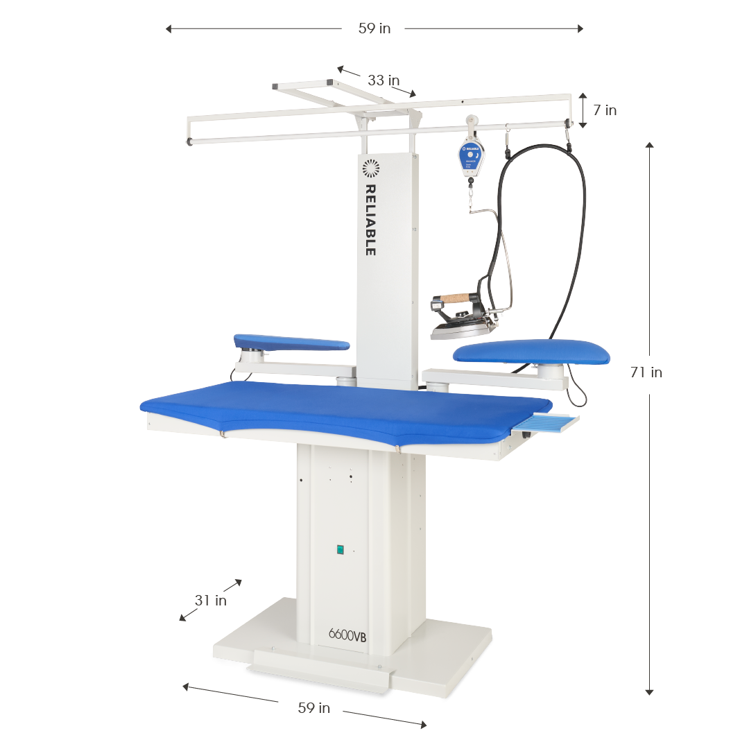The 6600VB Rectangular Professional Ironing Board, equipped with a heated work surface and a potent vacuum motor, offers flexibility for tailoring. With a built-in vacuum and heating element for the pressing surface, sleeve arm, and utility buck, it maximizes efficiency, delivering long-lasting, professional results in less time. Ideal for pressing various garments, including shirts, pants, and jackets, the 6600VB includes features like an exhaust chimney, adjustable iron rest, and iron cord support. The 6600VB also includes a specially designed lifter set compatible with our professional steam irons, streamlining your workflow and enhancing safety during ironing sessions.