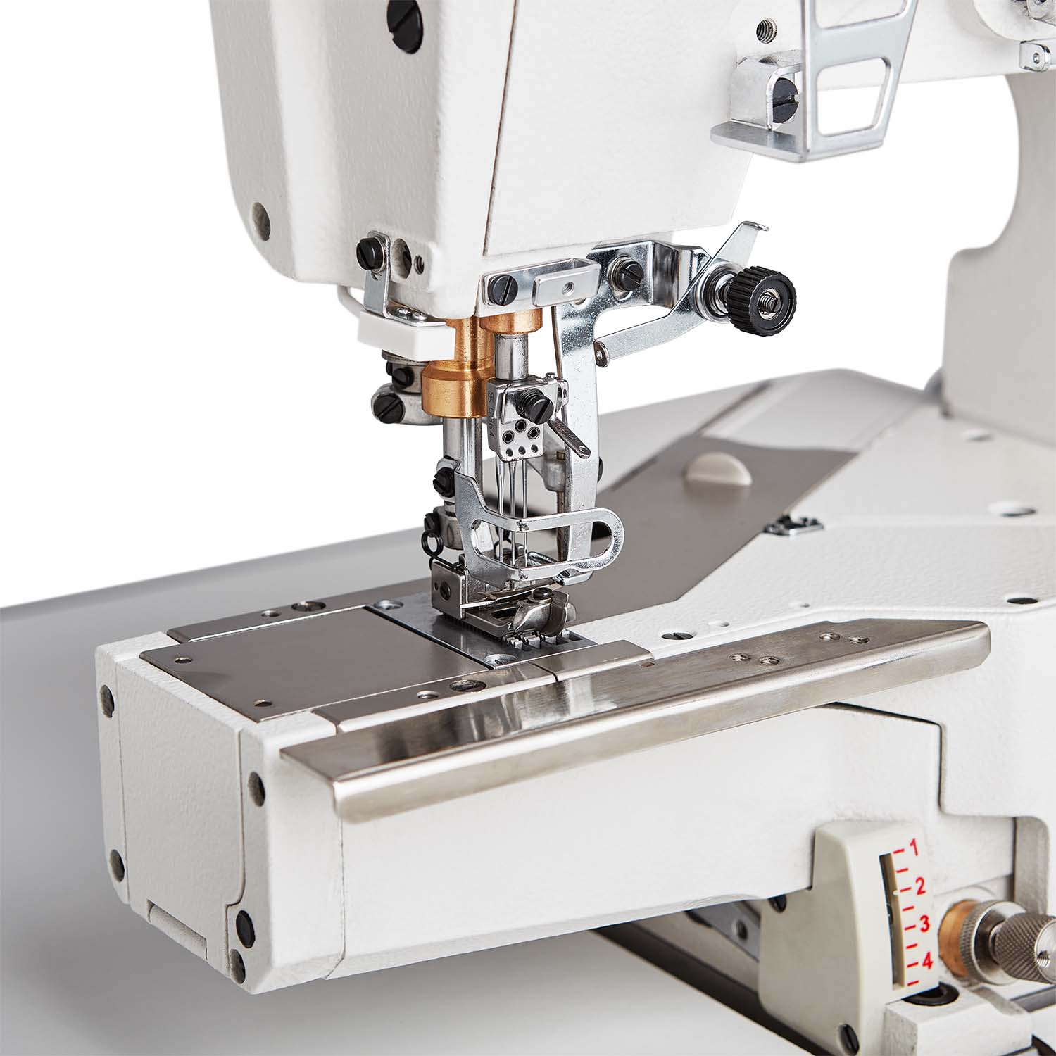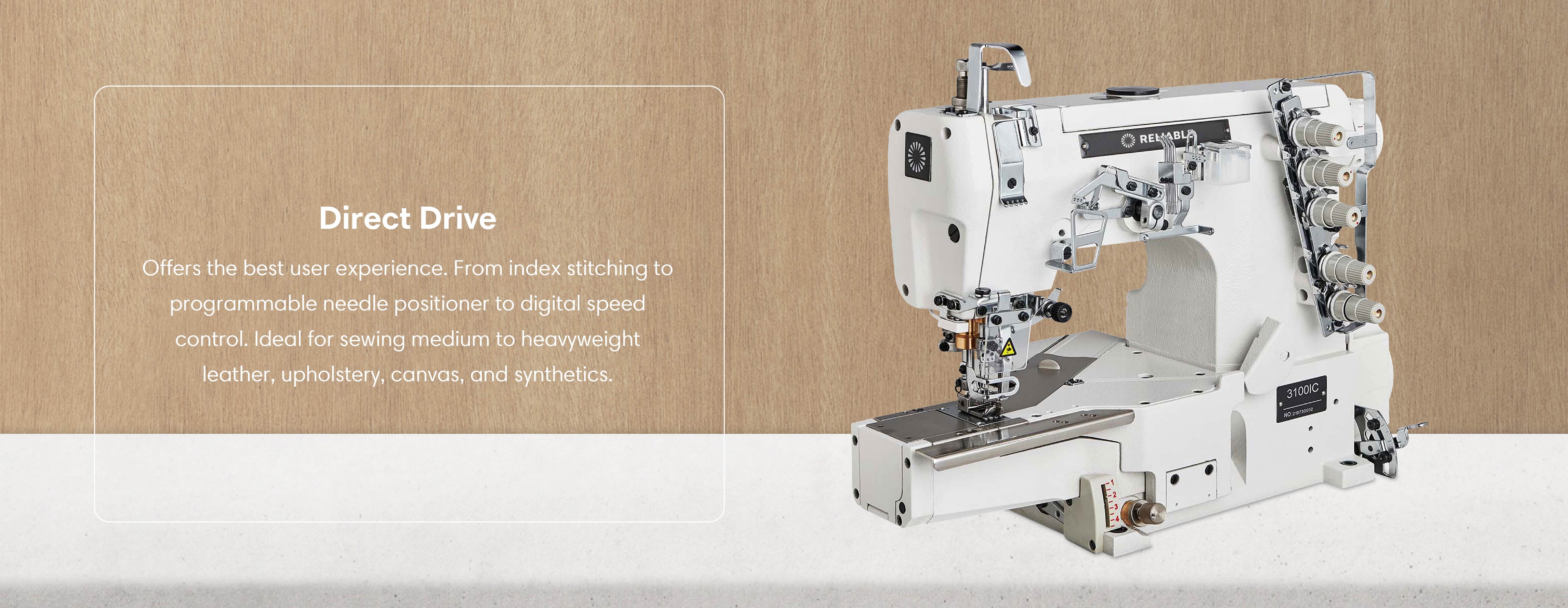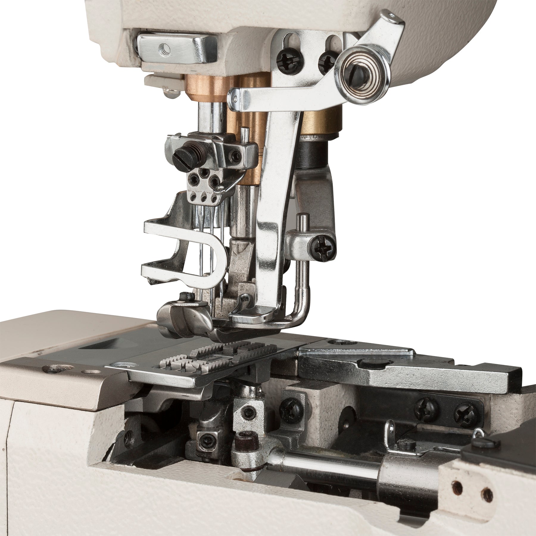 The 3100IC cylinder coverstitch machine with advanced Direct Drive technology provides the flexibility of using either 2 or 3 needles for hemming or for cover seaming. Direct Drive means there’s no more belt to replace and you get the most accurate speed control to fit every level of sewer’s needs. With easy to thread looper, no stain seal to trap and prevent oil from leaking, built-in release mechanism to allow for easy removal of the material and an eye and needle guard for your safety.