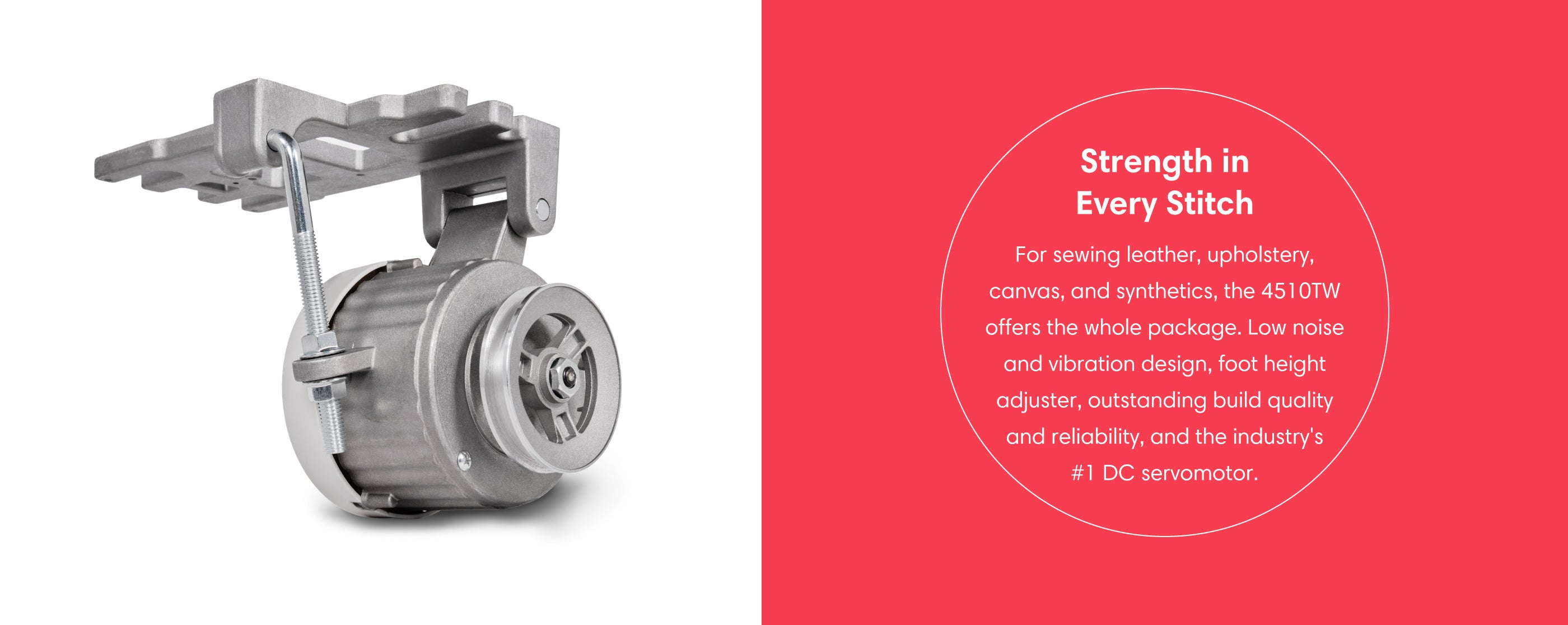 For sewing leather, upholstery, canvas, and synthetics, the 4510TW offers the whole package. Low noise and vibration design, outstanding build quality and reliability, and the industry's #1 DC servo motor.