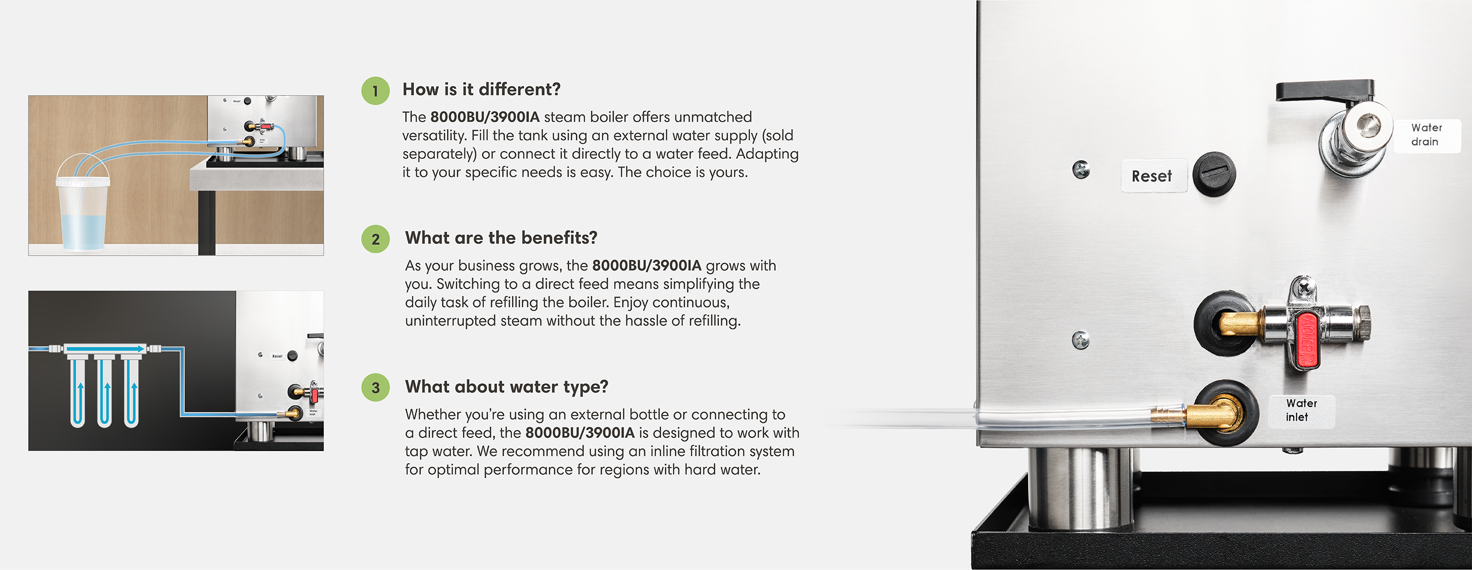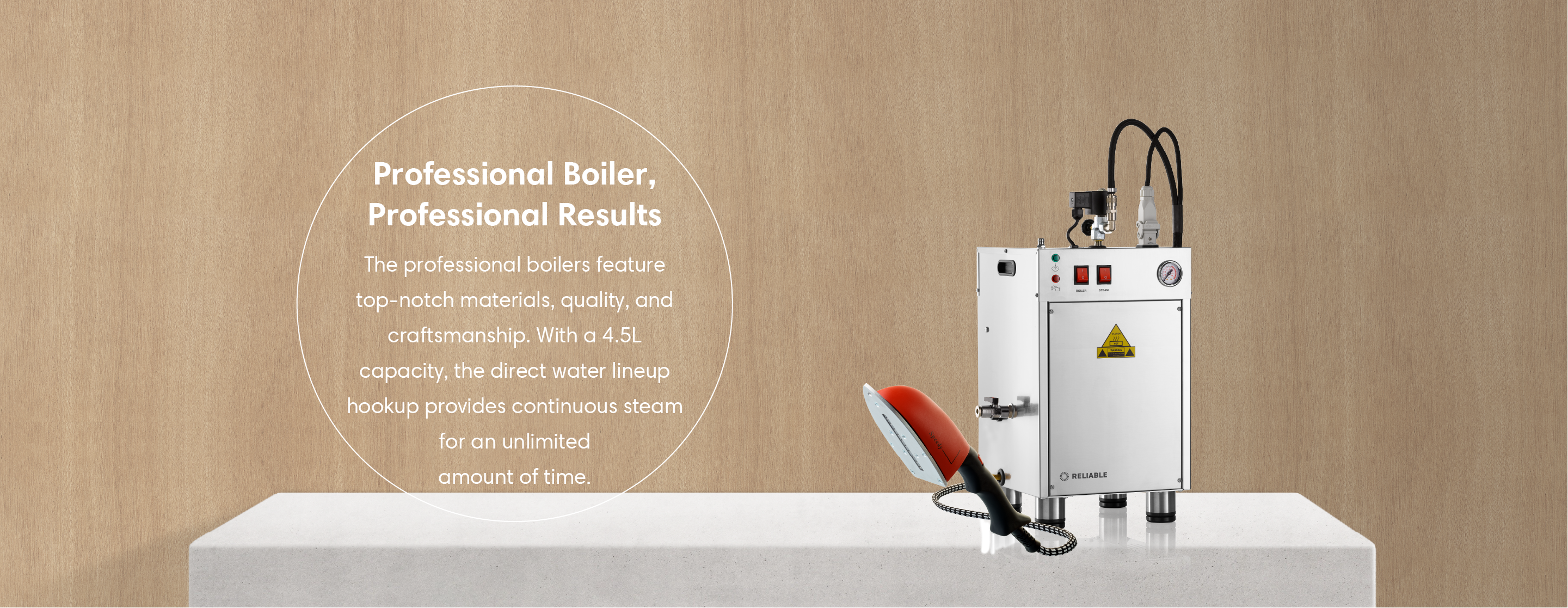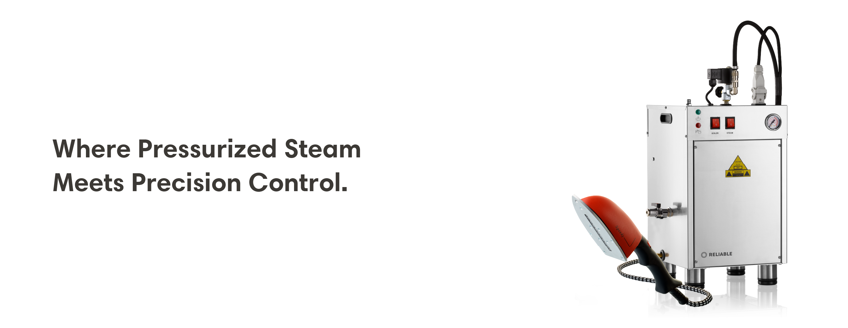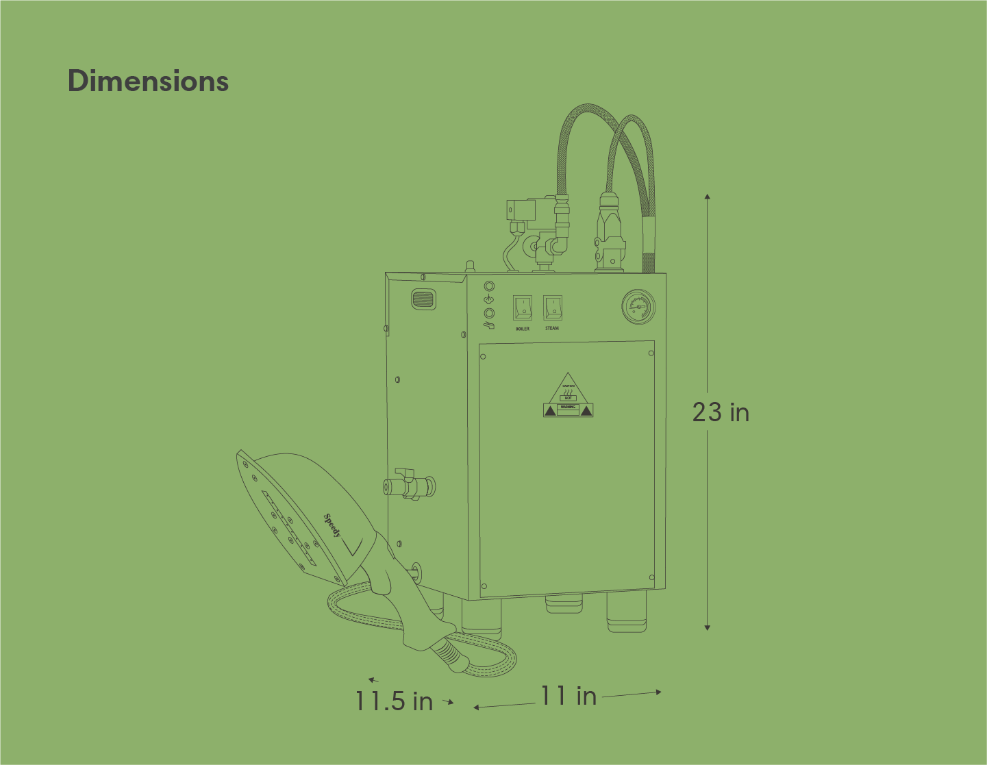 The 8000BU provides continuous steam for an unlimited amount of time when it’s hooked up to a direct water line (water line parts not included). Standard features are a heavy-duty contactor switch, blowdown valve, and heavy-duty legs. Paired with the 3900IA ironing steam wand, it produces a dry pressurized steam perfect for a wide variety of materials and applications. Proudly Made in Italy.