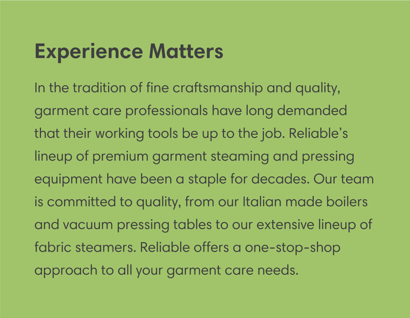 Whether it's irons, garment steamers, or ironing boards, Reliable has been at the forefront of development and innovation of home garment care. As new fabrics emerged, we kept developing our technology as well. Our irons have a full scope of settings and are powerful yet gentle on all fabrics, both natural and synthetic. We want to give home users tools that are just as good as the ones professionals use.