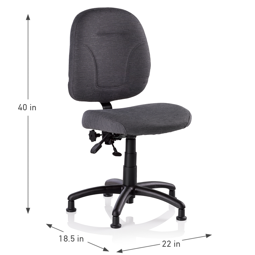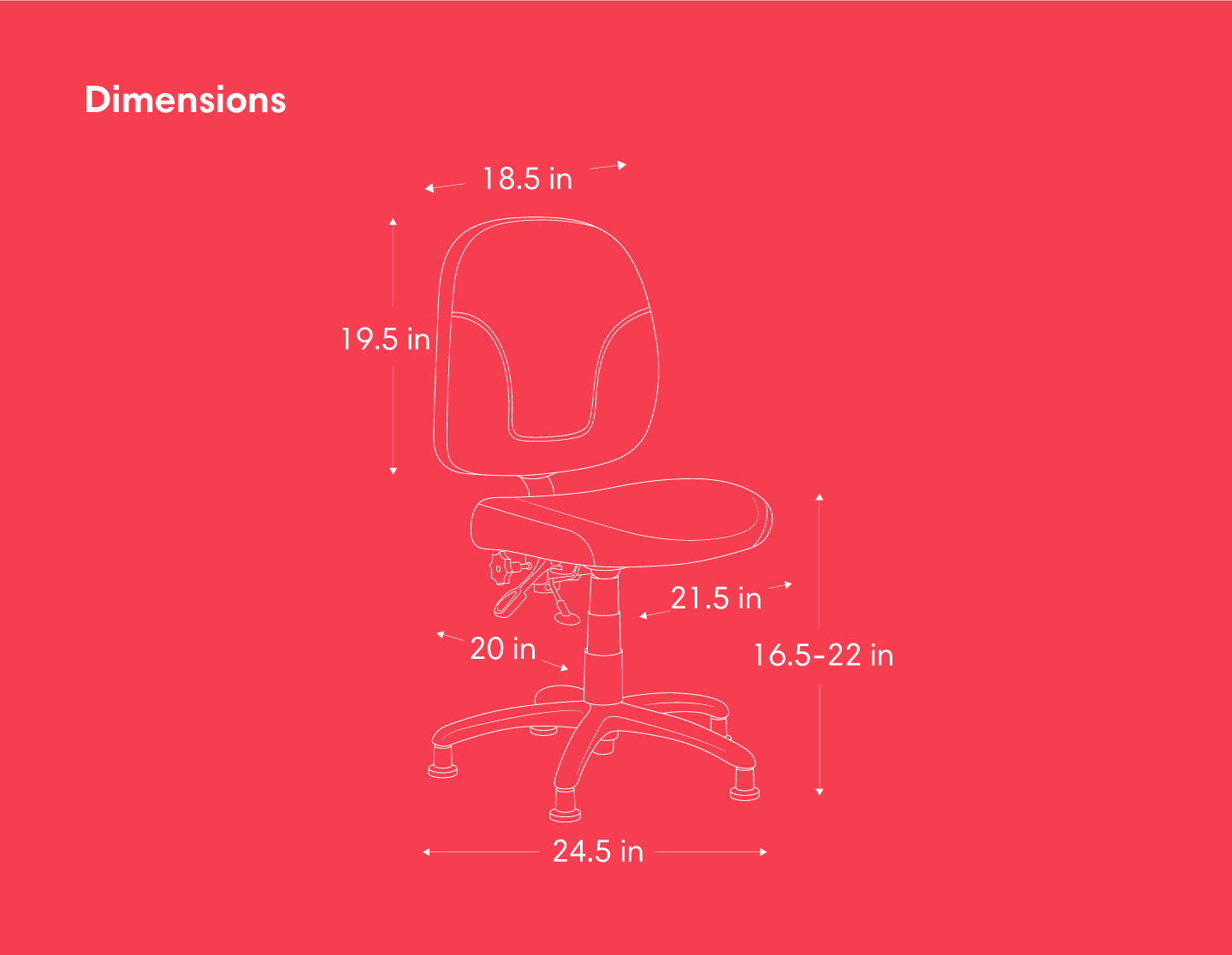 Product Dimensions 25" x 25" (width and length of base) 37.5"-42.5" (min-max chair height, with back rest at max height)