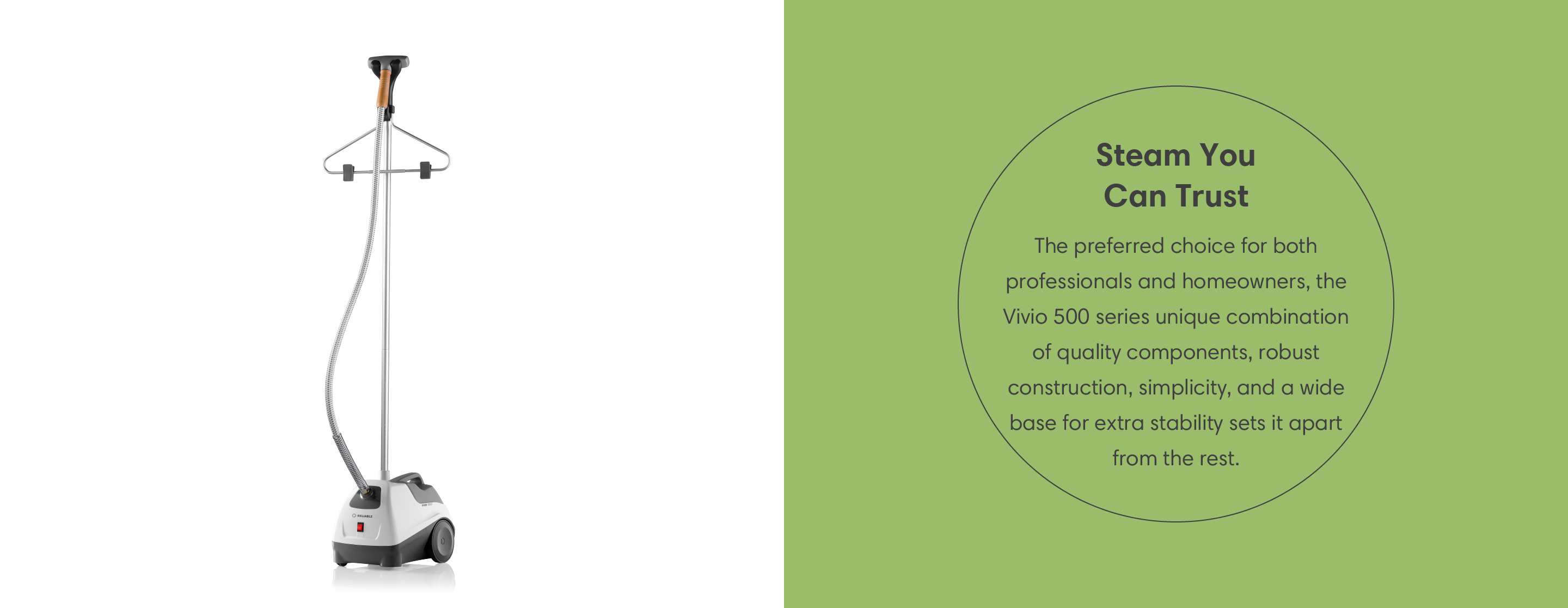 How do you improve on an icon? For us, bettering our 1st generation was a tough task. But our designers didn’t disappoint. We took all of the “good stuff” from our Vivio 150GC and added some things we wished we had thought of years ago. A new shape with a lower center of gravity, a water bottle that fits into a commercial sink for easy fill, a sleek steam head with yoke for easy removal, a hose covering to make it more comfortable to handle, and a removable hanger. The Vivio 550GC is the garment steamer reimagined.