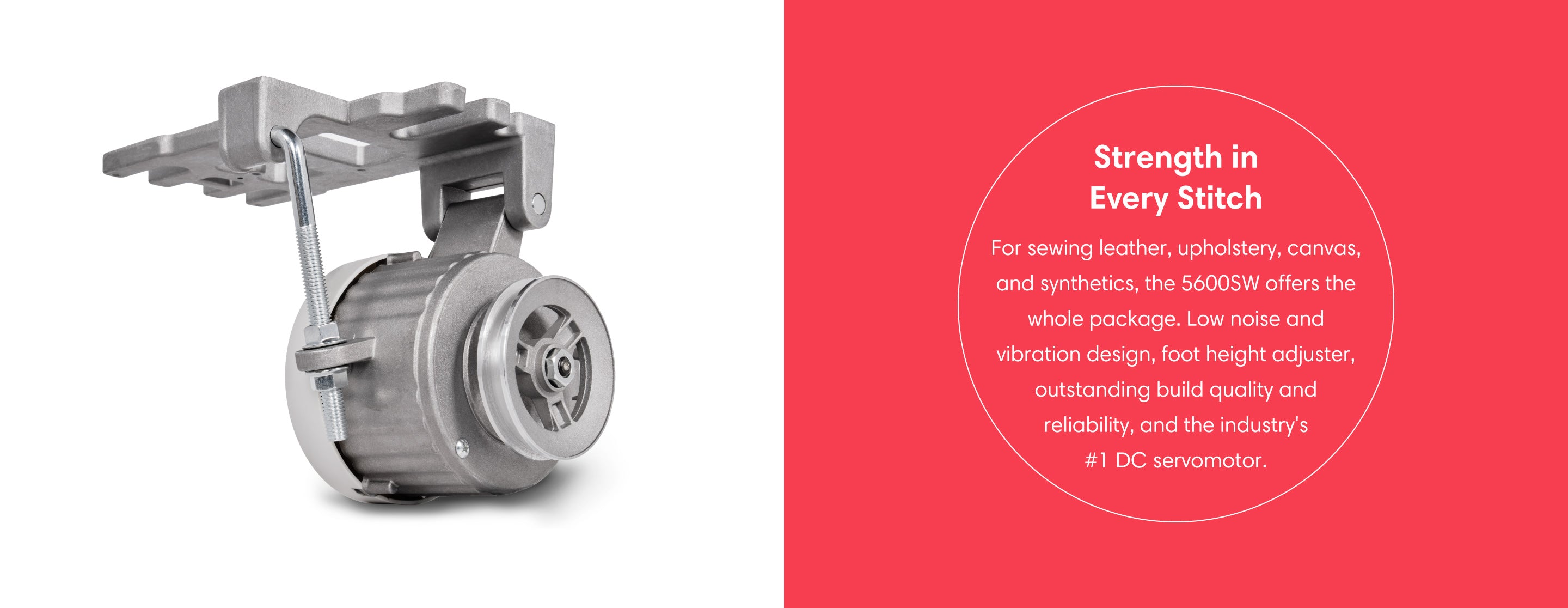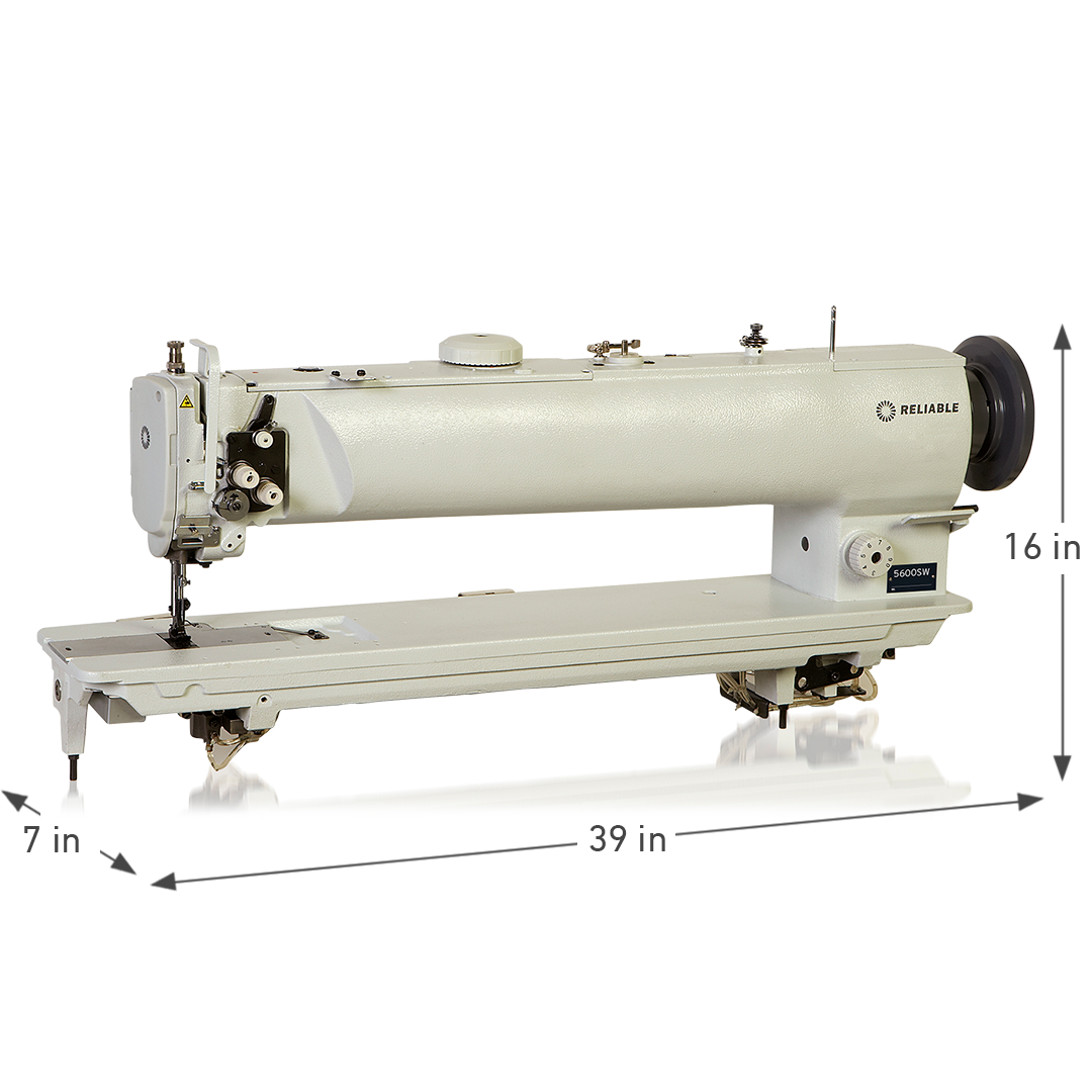 The 5600SW single needle, compound feed machine is a big machine. It’s so large in fact that we’ve added a bit of “Reliable magic” by including our #1 SewQuiet™ servo motor with the synchronizer so you can have all of the advantages of needle positioning functionality at no extra cost. A safety clutch, upper feed adjustment and a built-in bobbin winder complete this very capable machine for sewing medium to heavy weight leather, upholstery, canvas and synthetics.