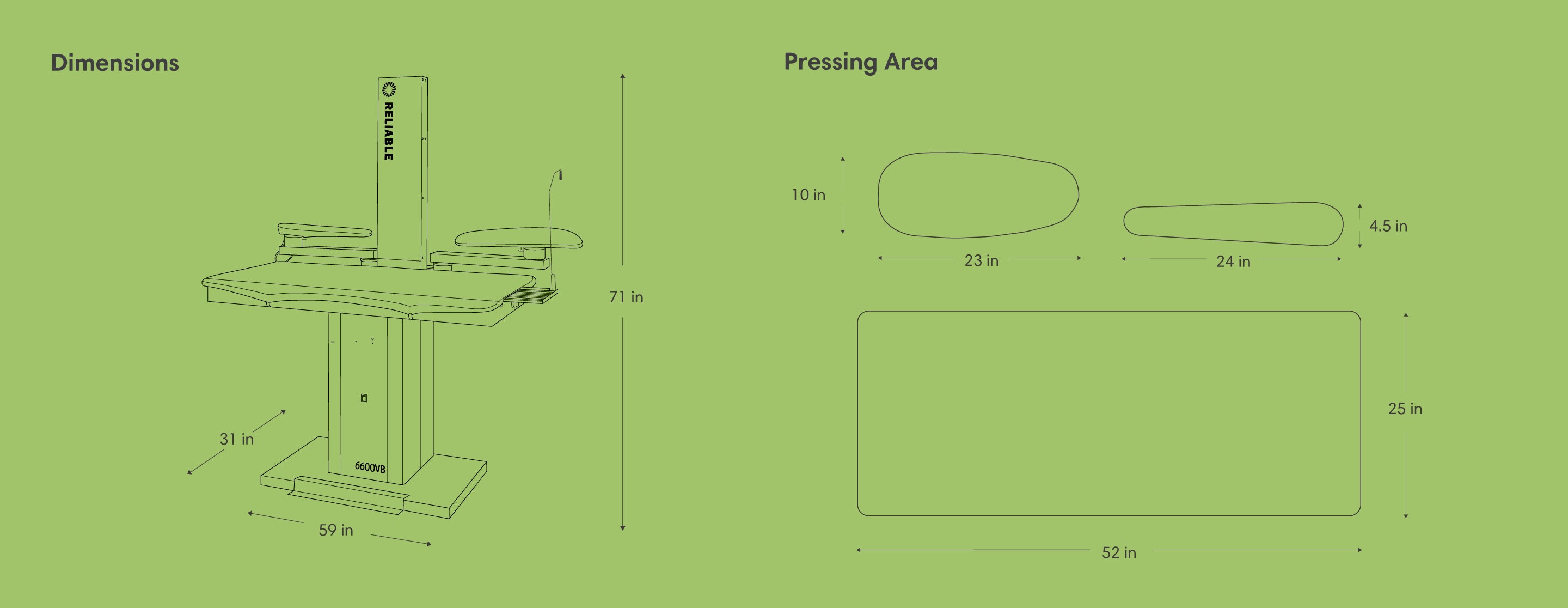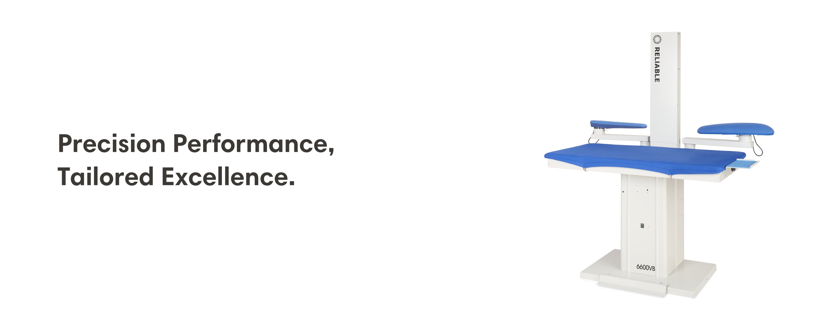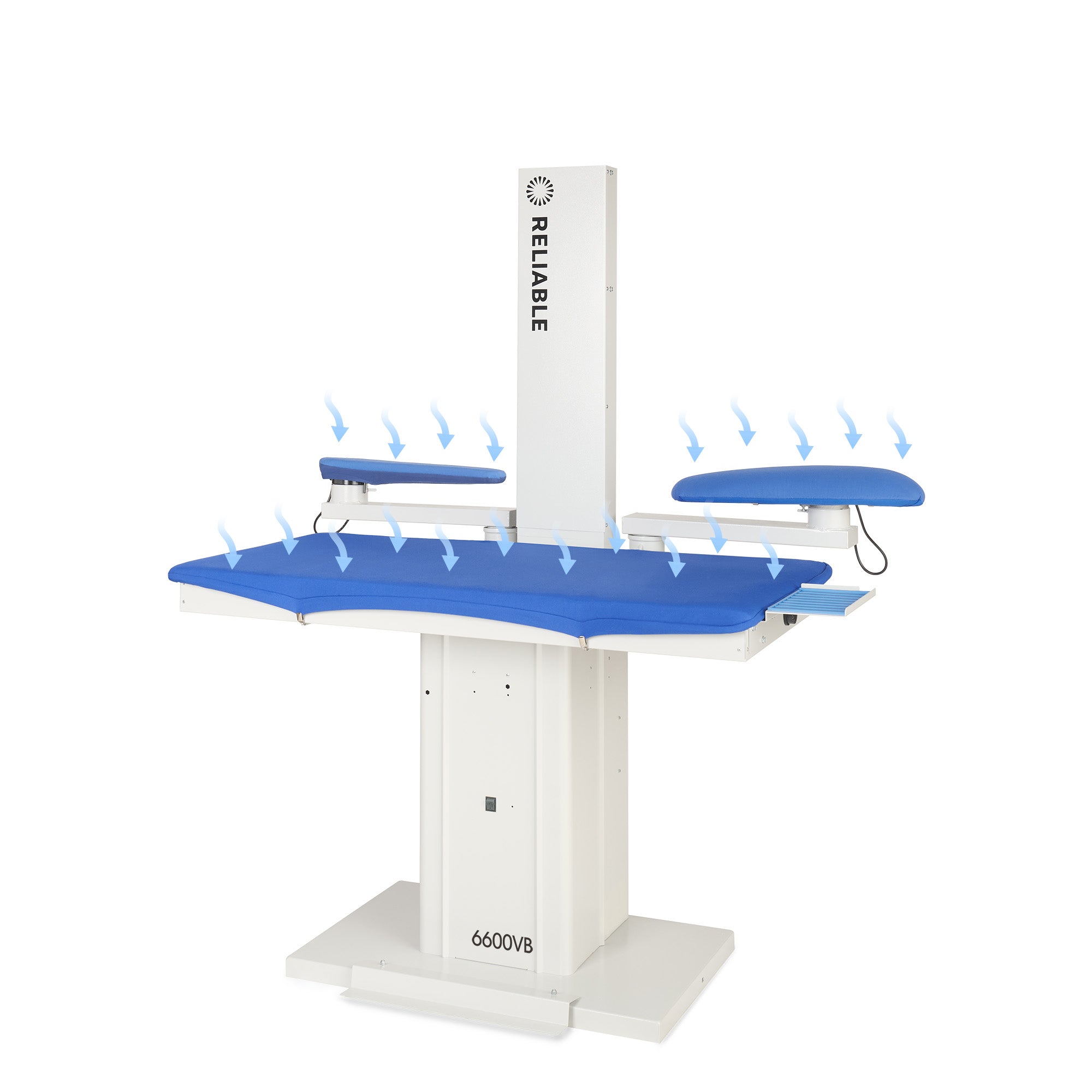The 6600VB will increase your efficiency by giving you long-lasting, professional results in less time. It's the professionals choice for pressing all types of garments, including shirts, pants, jackets, and more. We include an exhaust chimney for the air, an adjustable iron rest, and iron cord support. The main pressing surface has an external thermostat control to select the correct temperature.