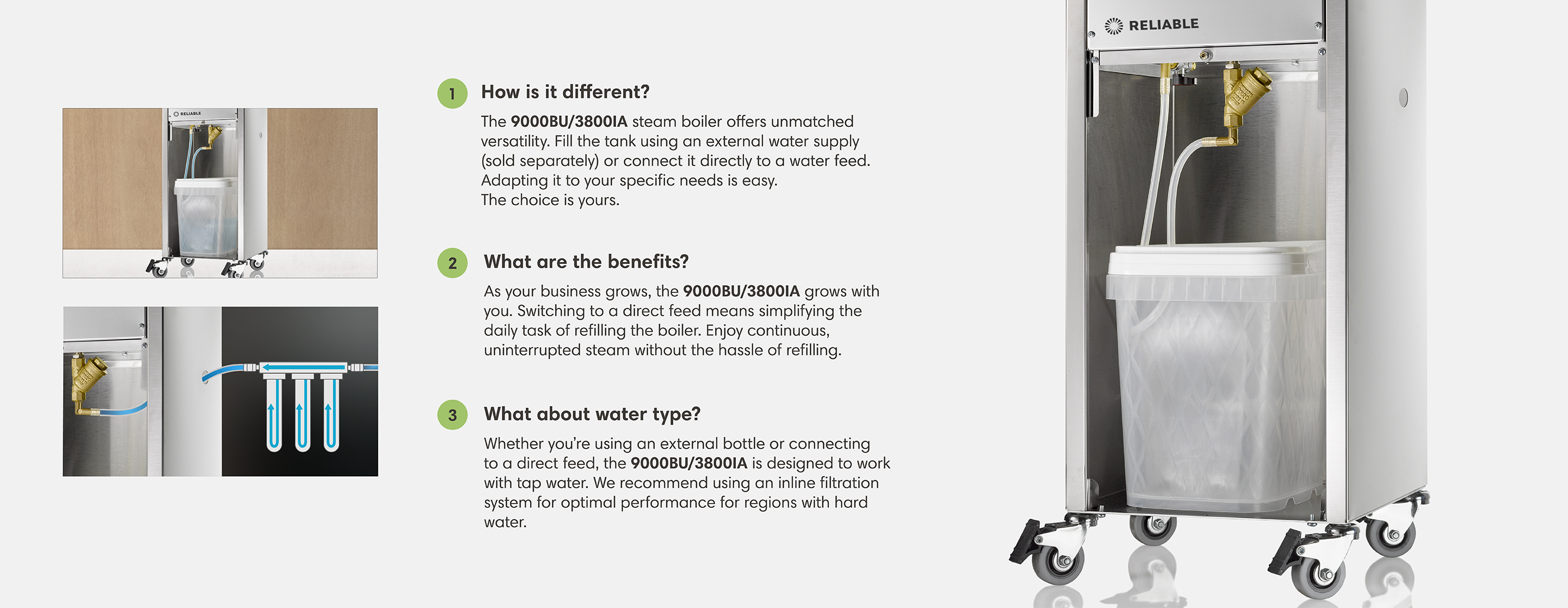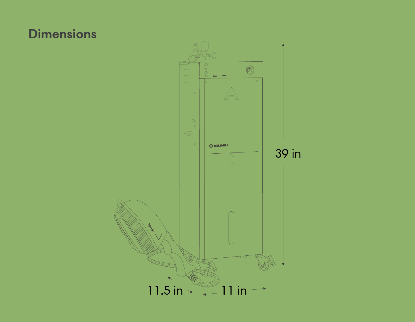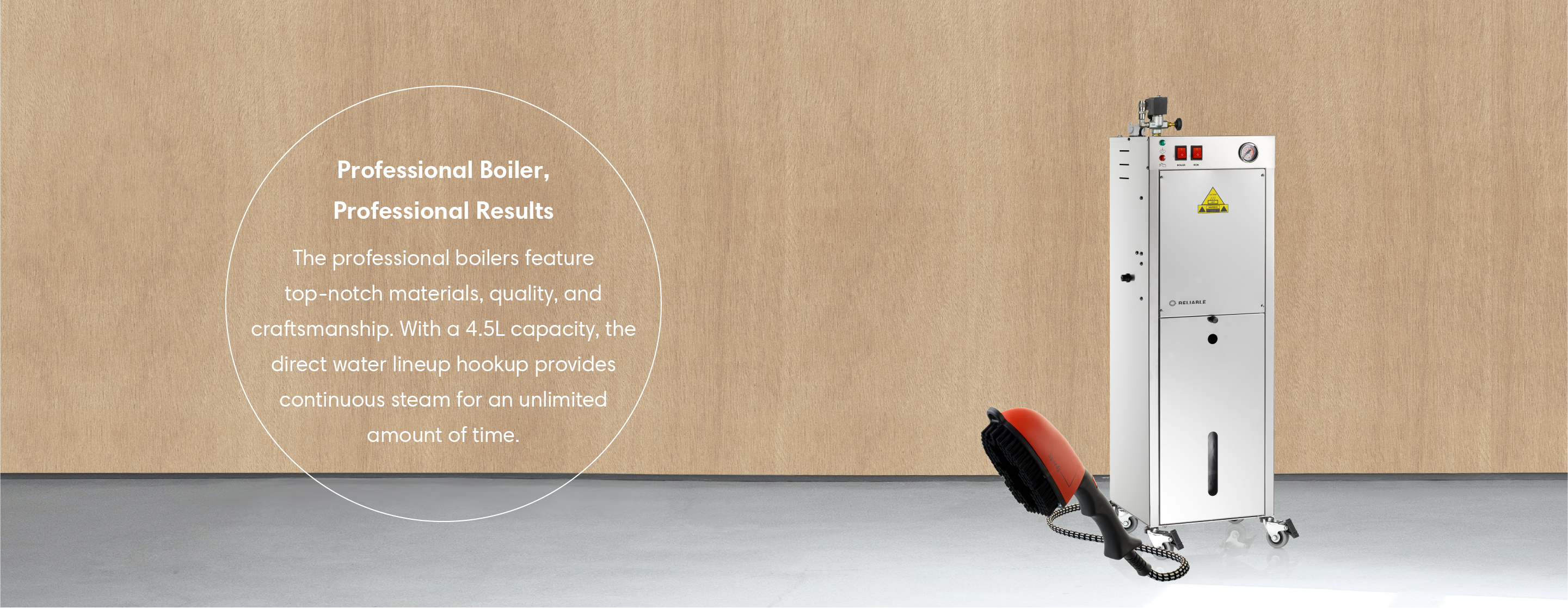 The 9000BU provides continuous steam for an unlimited amount of time when it is hooked up to a direct water line or with the turn of a lever with the provided separate 5L water tank. Standard features are a heavy-duty contactor switch, blowdown valve, and heavy-duty casters. Paired with the 3800IA steam brush, it produces dry pressurized steam perfect for a wide variety of materials and applications. Proudly Made in Italy.