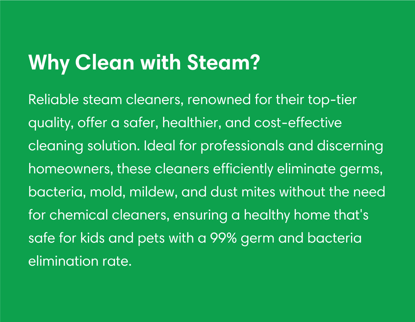 Steam cleaning kills 99.99% of bacteria. This includes E.coli, Staph bacteria, Salmonella, molds, bacteria, viruses, and other dirty things lurking around the house.