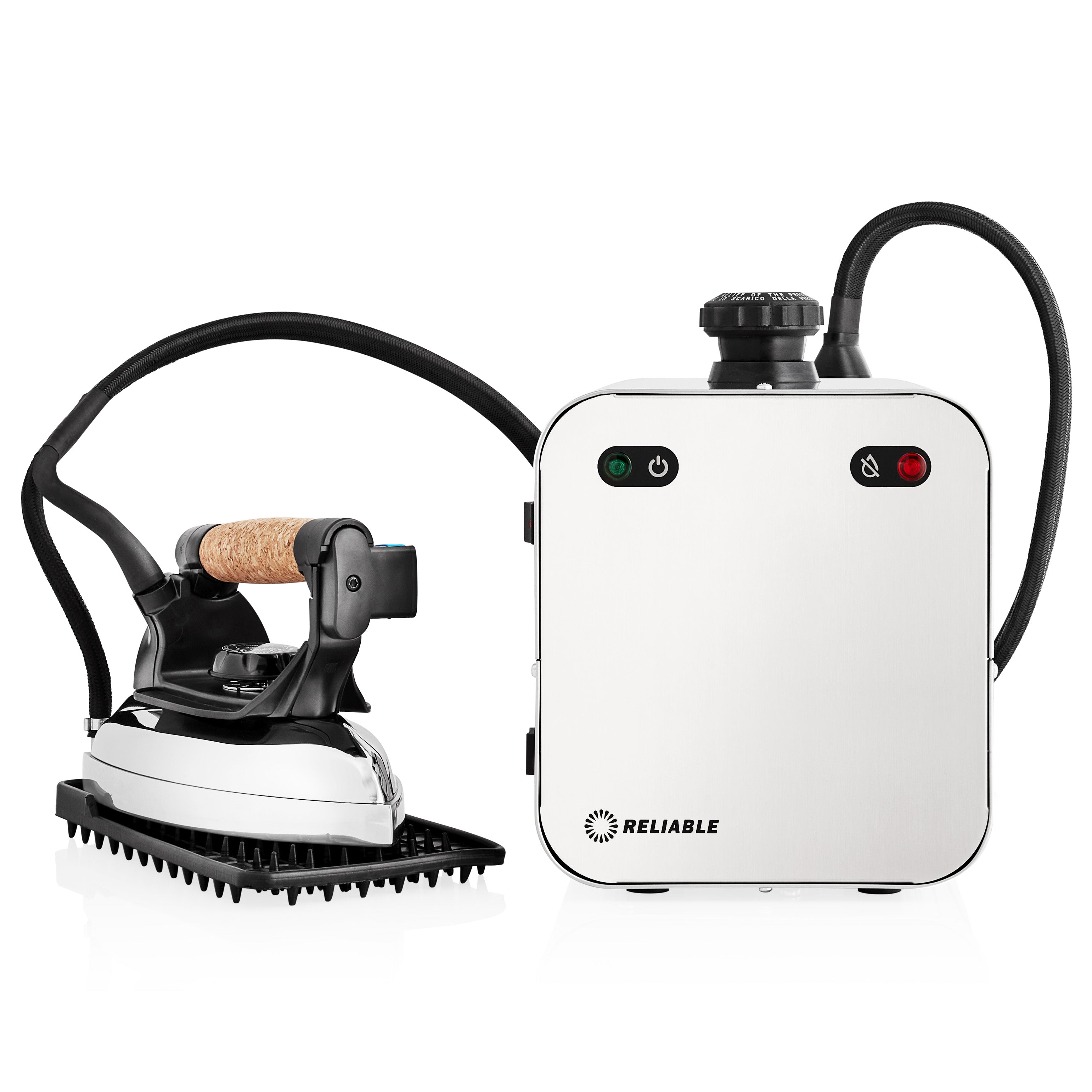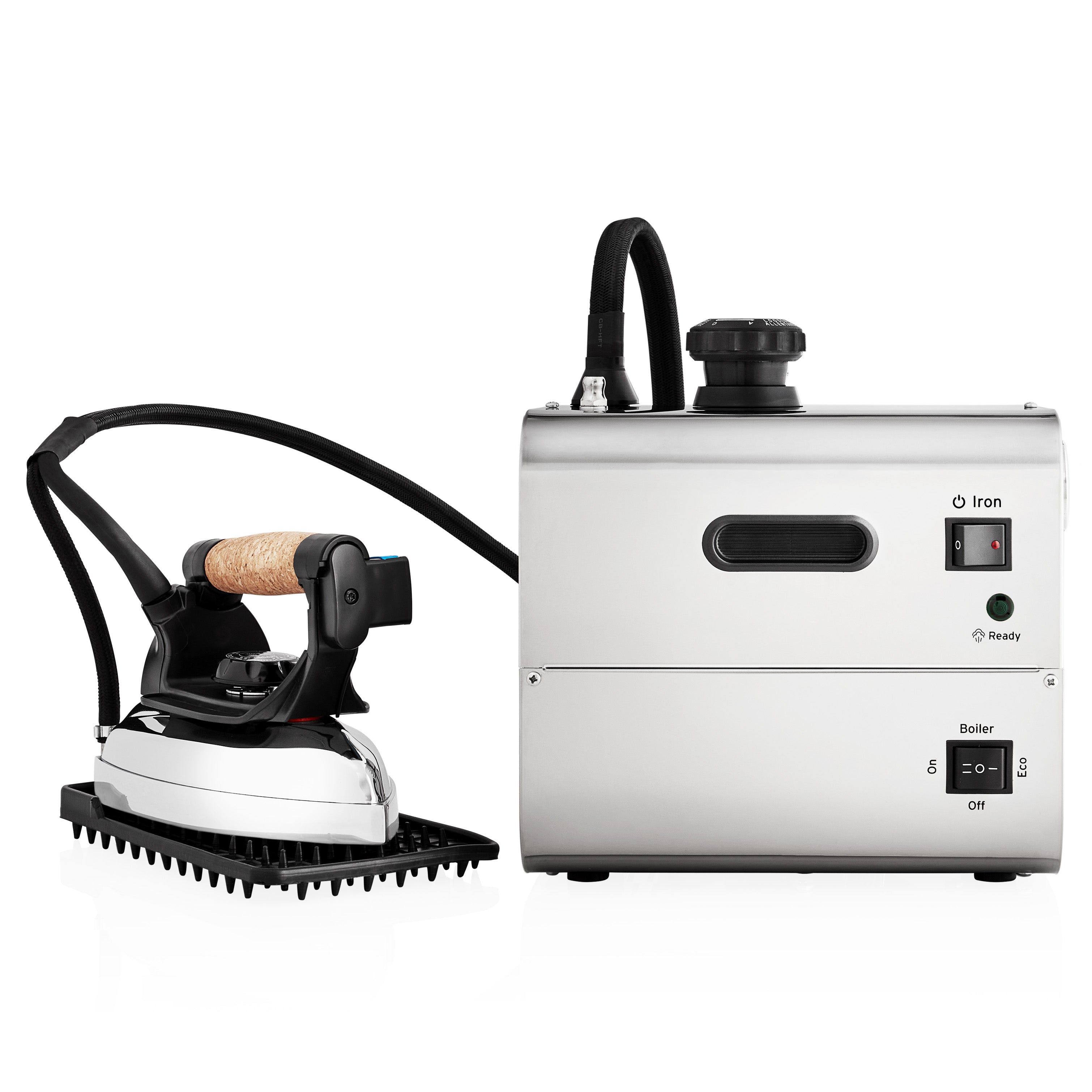 Introducing Eco-Mode in the all new 4100IS steam iron station. Eco-Mode will save you up to 33% in energy costs by reducing the energy consumption when the boiler is not being used. Smart for your wallet and smart for the planet. The 4100IS has an absolute capacity of 2.2L, uses our new external heating element system to optimize the amount of steam available to use and has an operating pressure of 3.5 bar / 50 P.S.I. for maximum ironing efficiency. The professional cork handled iron, made for tailors, seamstresses, sewists and garment production uses our exclusive 32 steam chamber design to prevent condensation and provide dry steam.