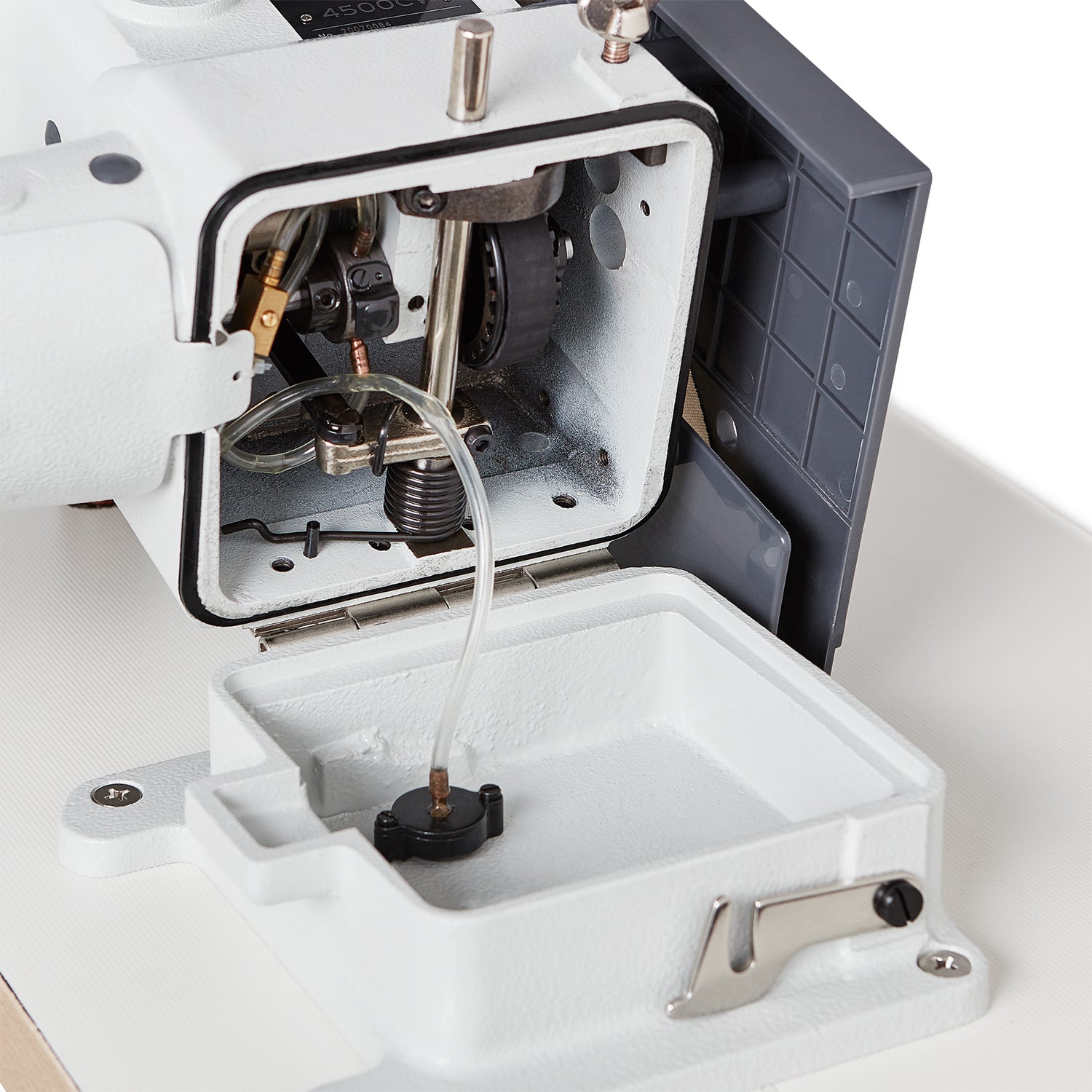 The 4500CW is our new flagship cylinder walking foot, compound feed sewing machine. Whether you are sewing cushions, bags, heavy-canvas, or a variety of other heavy materials, the 4500CW is built tough. Equipped with a large take-up mechanism with dual tension adjustments and a drop-in bobbin for easy access. We have added a synchronizer for the SewQuiet 6000SM motor to make corner stitching easier, a safety clutch mechanism, and a built-in bobbin winder.
